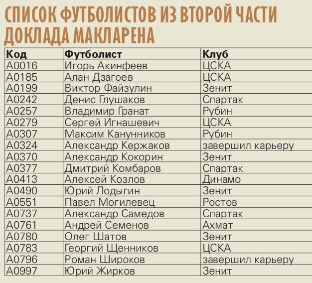 Как утверждает Telegram-канал «Мутко против», в списке главы независимой комиссии WADA Ричарда Макларена числятся 12 футболистов «триколор». Все они являются ведущими игроками национальной команды и должны выступать на предстоящем ЧМ-2018.