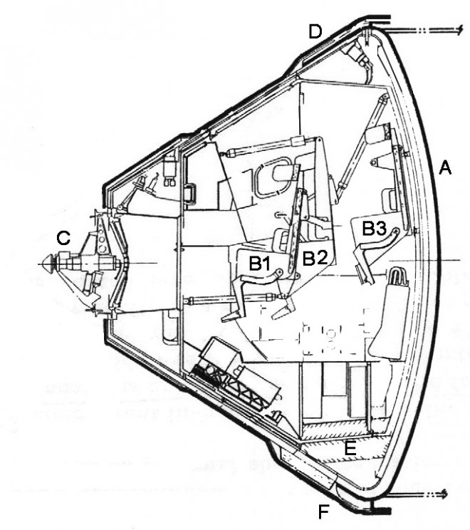 | Марсианский командный модуль (CM). A = тепловой экран; B1 = передняя средняя кушетка экипажа; B2 = правое кресло для экипажа; B3 = после средней кушетки экипажа; C = стыковочный узел зонда типа «Аполлон»; D = корпус для жизнеобеспечения и шлангокабелей передачи данных, соединяющих CM с сервисным модулем (SM); E = изотопная энергетическая система ртуть-ранкин; F = корпус для изотопного охлаждения энергосистемы и электрических шлангокабелей, соединяющих CM и SM. Кредит изображения; Североамериканская авиация / НАСА. |